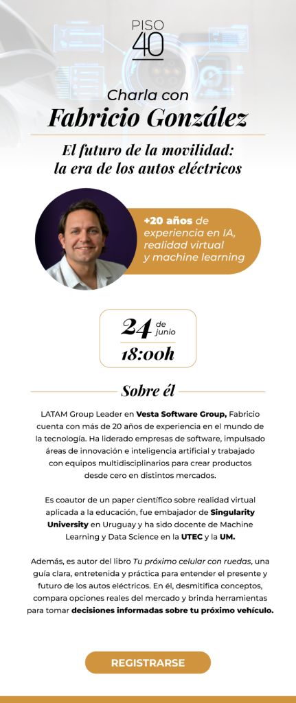 Contaremos con la presencia de Fabricio González, LATAM Group Leader en Vesta Software Group, con más de 20 años de experiencia en el mundo de la tecnología. Ha liderado empresas de software, impulsado áreas de inteligencia artificial y es autor del libro Tu próximo celular con ruedas, una guía clara y entretenida para entender el presente y futuro de los autos eléctricos.