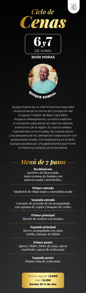 Los días 6 y 7 de junio, recibimos a Quique Sobral, chef entrerriano que combina tradición e innovación para poner en valor los sabores autóctonos de la región. Su cocina integra sabores como el yatay, las nueces pecan y los pescados de río. ¡Te espera un menú de 7 pasos que honran la historia y conectan con lo ancestral!