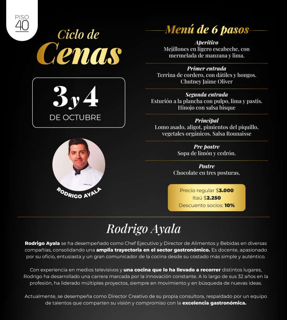 Los días 3 y 4 de octubre recibimos al chef Rodrigo Ayala, reconocido por su sólida trayectoria en la gastronomía nacional e internacional. Serán dos noches especiales, con un menú diseñado exclusivamente para la ocasión, donde la técnica, el producto y la experiencia se combinan para ofrecer una propuesta cuidada en cada detalle. Una invitación a disfrutar de la cocina con mirada contemporánea y sello propio.