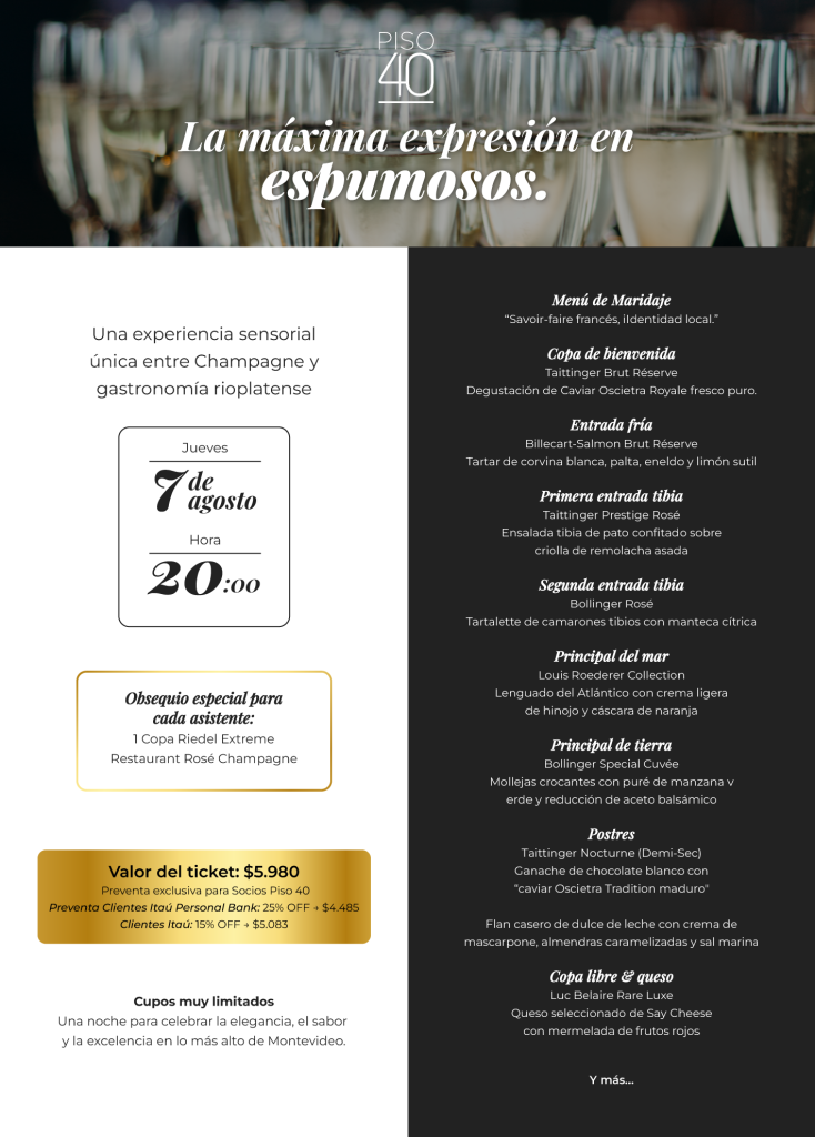 Una travesía por los sabores del Río de la Plata armonizados con espumosos de algunas de las casas más reconocidas de Francia. Todo acompañado por una propuesta gastronómica exclusiva del restaurante Piso 40 y el prestigioso Caviar Black River.